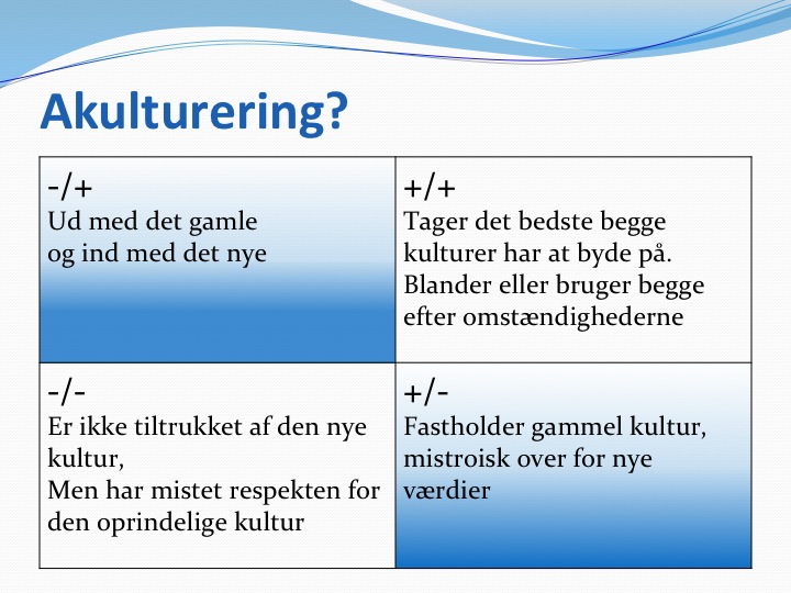 Inden for psykologien taler man om, at der er fire forskellige udfald af dette kultur sammenstød.