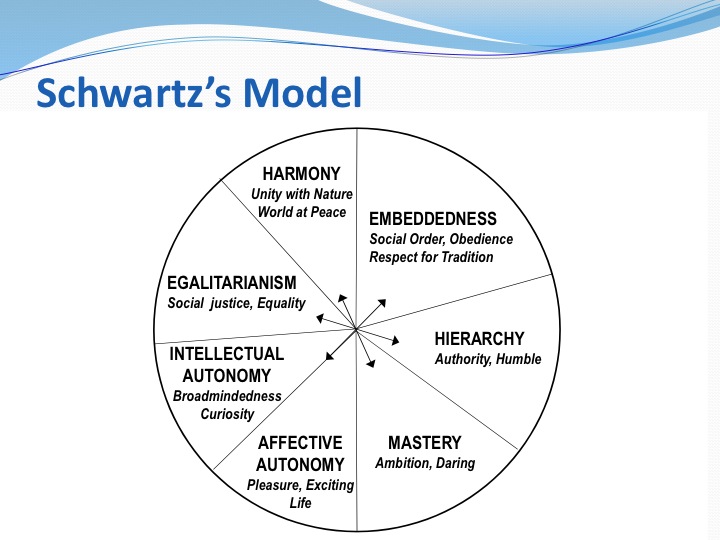 The circle structure doesn't just delineate these three "axes". Cultures normally don't "cross-over", so you will not find cultures that are simultaneously high on Harmony, Hierarchy, and Autonomy. Neither are Embeddedness, Mastery, and Egalitarianism likely combinations.